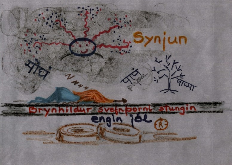 The ignorant man starts practicing transcendence, Óðinn given to Óðinn, — and Ullur, the fire of knowledge, burns up Gymisgarðar / paradise which we carry from the animal stages into human lives