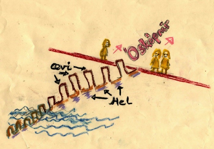below the red line life-spans as animals, and the breaks at Helia, our origin in the sea, our evolution for some millions of life-spans perhaps;