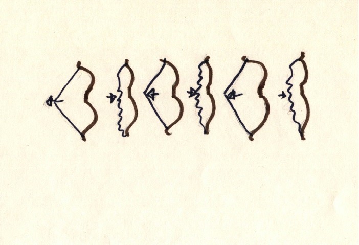 we do not pull the bow-string, let go, pull a little, stop pulling, no ! we are only going to put the arrow on the string, pull back, and shoot;