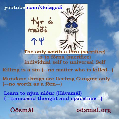Meiðmar, to give in return for the given, is done by transcending the mundane Gungnir, contact inner Self, the Being. The best fórn to fórna (bring to the feast) oneself, the pure oneself,