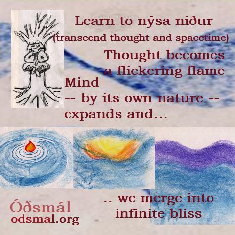 When we practice nýsa niður (–Hávamál; nose down–), thought becomes a tiny flickering flame only, and then expands, to then contact pure consciousness. This contact is pure bliss. Glaðheimar of Óðinn/us.