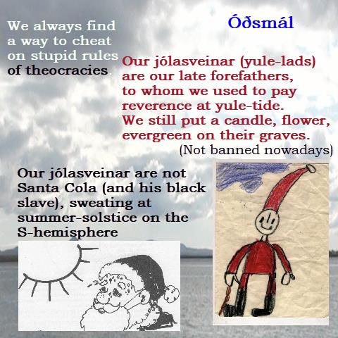 The Icelandic jólasveinar (jóla-sveinar) are not any santa-cocacola man, St.Nicoai from Mira. Óðsmál teaches that they are our gone forefathers, visiting us at the delicate time of yule-tide.